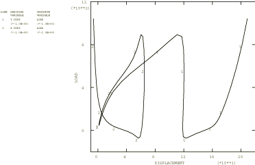 In the Riks procedure actual values of load magnitudes cannot be specified. Instead, they are computed as part of the solution, as the “load proportionality factor” multiplying the load magnitudes given on the loading data lines. User-prescribed load magnitudes serve only to define the direction and to estimate the magnitude of the initial increment of the load for a step. This initial load increment is the product of the ratio of the initial time increment to the time period and the load magnitudes given in the loading options. The user can terminate a Riks analysis by specifying either a maximum load proportionality factor or a maximum displacement at a node, or both. When a solution point is computed at which either of these limits is crossed, the analysis will stop. In any event, or if neither option is used, the analysis ends when the maximum number of increments for the step is exceeded.