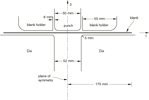 The blank initially measures 350 mm by 35 mm and is 0.78 mm thick. The problem is essentially a plane strain problem (the out-of-plane dimension for the blank is 35 mm). A cross-section of the geometry of the die, the punch, the blank holder, and the blank is shown in Figure 1. The total blank holder force is 2.45 kN, and a mass of 5 kg is attached to the blank holder. A coefficient of friction of 0.144 is used for all interacting surfaces.