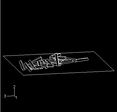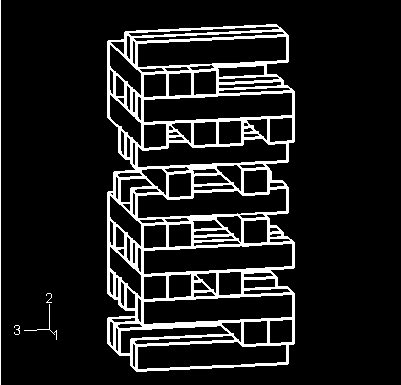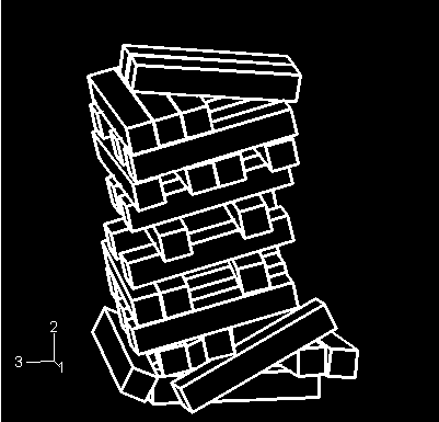 The model simulates the collapse of a stack of blocks. The undeformed configuration of the model is shown in Figure 1. There are 35 blocks, and each block is 12.7 × 12.7 × 76.2 mm (0.5 × 0.5 × 3 inches) in size. The blocks are stacked on a rigid floor. The stack is subjected to gravity loading. It is assumed that a key block near the bottom of the stack has been removed just before the start of the analysis, initiating the collapse.