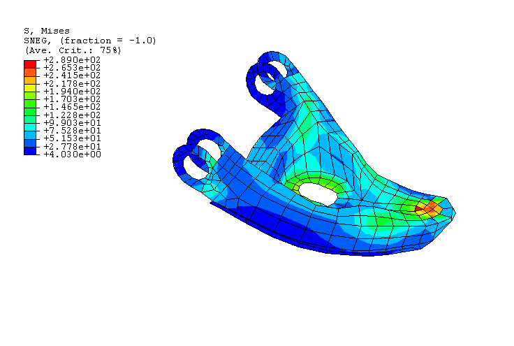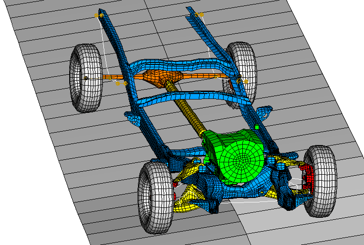 Several parts deform too much to be considered substructures and are modeled using regular elements. The leaf springs in the back and the stabilizer bar in the front are both modeled with beam elements. The front brake assemblies are modeled as rigid bodies.