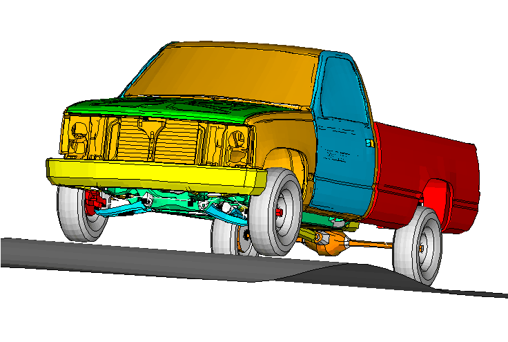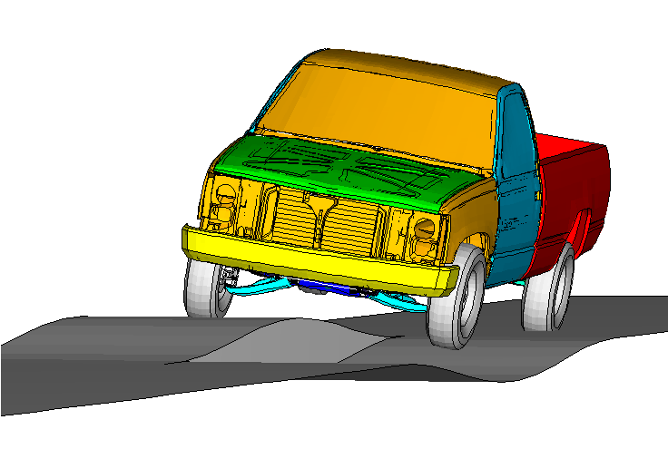 The pick-up truck model (1994 Chevrolet C1500) discussed here is depicted in Figure 1 riding over antisymmetric bumps. The model geometry, element connectivity, and material properties are obtained from the Public Finite Element Model Archive of the National Crash Analysis Center at George Washington University. The materials used are described in Inertia relief in a pick-up truck.