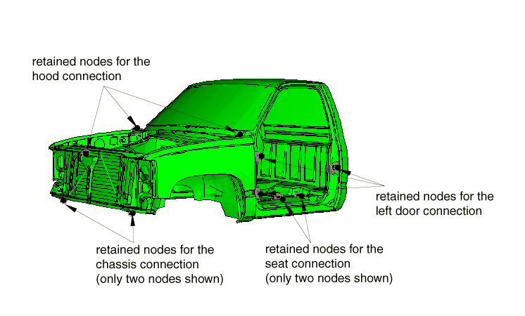 The number of retained nodes for each substructure is determined primarily by its connection points with neighboring parts as illustrated in Figure 2 for the cabin substructure. There are twenty points associated with this substructure that are used to connect the cabin to other parts in the model. There are six retained nodes on the cabin bottom (connections to the chassis); three retained nodes for the hood connections (two hinges and the hood lock); three retained nodes for each of the two door connections (two hinges in the front and the door lock in the back); four retained nodes for the seat connections; and one node retained at the center of mass of the vehicle used for yaw, pitch, and roll measurement purposes.