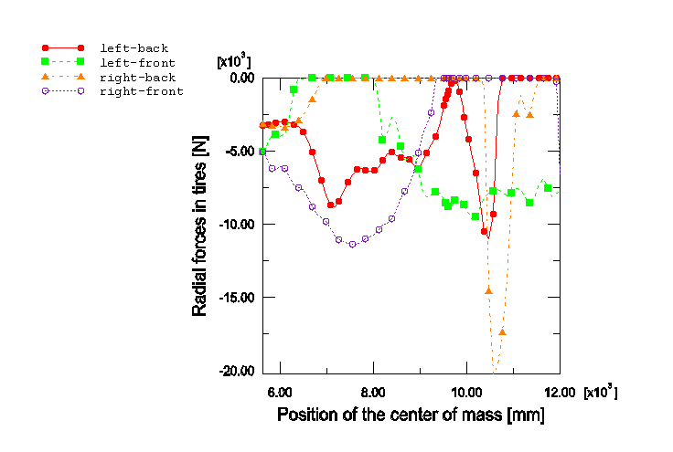 The radial forces in the tires are modeled approximately using a simplified CALSPAN tire model (Frik, Leister, and Schwartz, 1993) implemented via user subroutine UEL. A radial stiffness of 600 N/mm is considered.