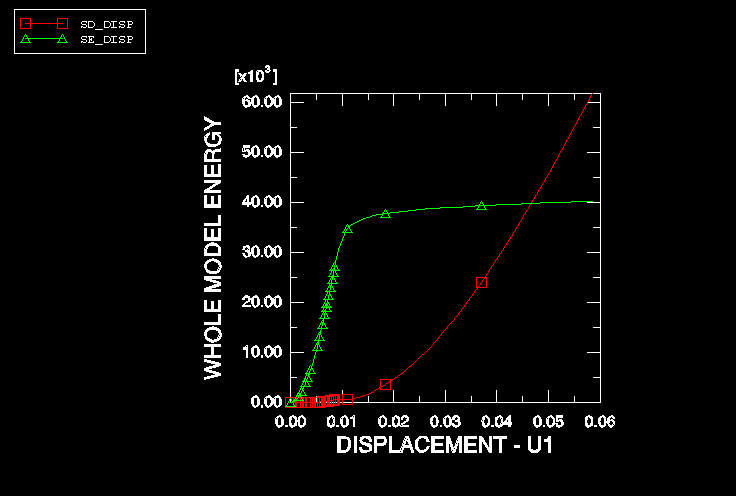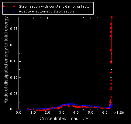 To provide stability to the numerical solution upon the anticipated buckling, automatic stabilization based on volume proportional damping is added to the model. Two forms of automatic stabilization are considered: one with a constant damping factor that is chosen by default (see Automatic Stabilization of Static Problems with a Constant Damping Factor), and one with an adaptive damping factor (see Adaptive Automatic Stabilization Scheme).