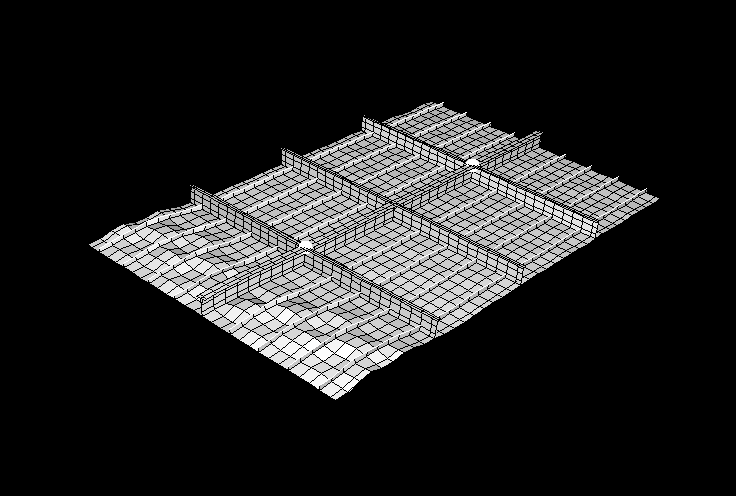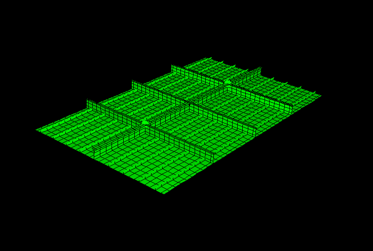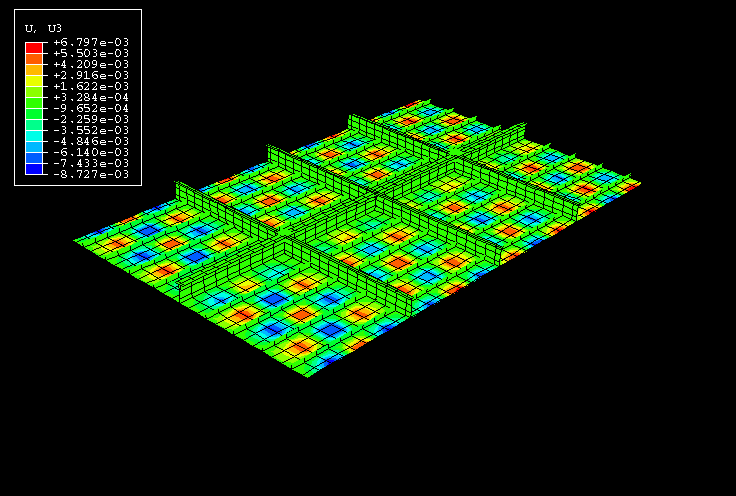 The model consists of a rectangular plate 10.8 m (425.0 in) long, 6.75 m (265.75 in) wide, and 5.0 mm (0.2 in) thick. This plate has several reinforcements in both the longitudinal and transverse directions (Figure 1). The plate represents part of a larger structure: the two longitudinal sides have symmetry boundary conditions, and the two transverse sides have pinned boundary conditions. In addition, springs at two major reinforcement intersections represent flexible connections to the rest of the structure. The mesh consists of S4 shell elements for both the plate and larger reinforcements and additional S3 shell and B31 beam elements for the remaining reinforcements. The entire structure is made of the same construction steel, with an initial flow stress of 235.0 MPa (34.0 ksi).