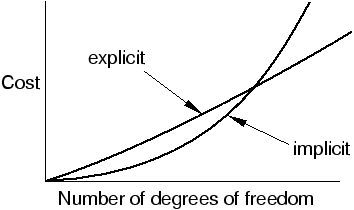 Whereas predicting the cost increase with mesh refinement for the explicit method is rather straightforward, cost is more difficult to predict when using the implicit method. The difficulty arises from the problem-dependent relationship between element connectivity and solution cost, a relationship that does not exist in the explicit method. Using the implicit method, experience shows that for many problems the computational cost is roughly proportional to the square of the number of degrees of freedom. Consider the same example of a three-dimensional model with uniform, square elements. Refining the mesh by a factor of two in all three directions increases the number of degrees of freedom by approximately 23, causing the computational cost to increase by a factor of roughly (23)2, or 64. The disk space and memory requirements increase in the same manner, although the actual increase is difficult to predict. The explicit method shows great cost savings over the implicit method as the model size increases, as long as the mesh is relatively uniform. Figure 1 illustrates the comparison of cost versus model size using the explicit and implicit methods. For this problem the number of degrees of freedom scales with the number of elements. ![]() |