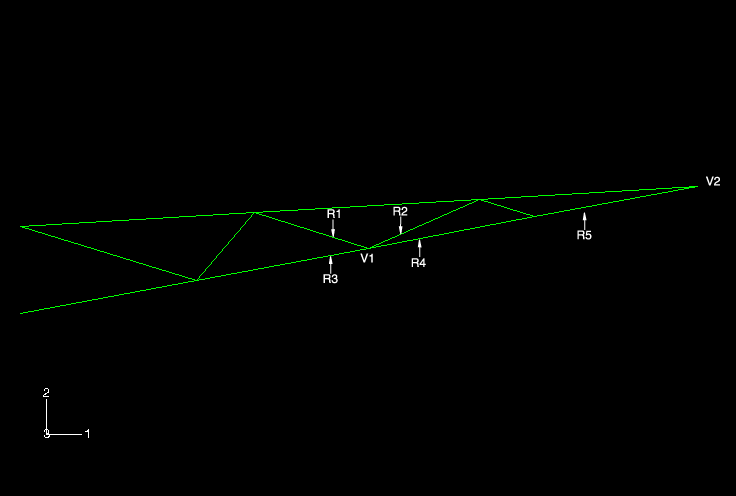 Figure 1 shows the geometry of the truss structure. ![]() Referring to this figure, the correct geometry for the crane model requires three independent beam normals at vertex V1: one each for regions R1 and R2 and a single normal for regions R3 and R4. Using the Abaqus logic for averaging normals, it becomes readily apparent that the beam normal at vertex V1 in region R2 would be averaged with the normals at this point for the adjacent regions. In this case the important part of the averaging logic is that normals that subtend an angle less than 20° with the reference normal are averaged with the reference normal to define a new reference normal. Assume the original reference normal at this point is the normal for regions R3 and R4. Since the normal at vertex V1 in region R2 subtends an angle less than 20° with the original reference normal, it is averaged with the original normal to define a new reference normal at that location. On the other hand, since the normal at vertex V1 in region R1 subtends an angle of approximately 30° with the original reference normal, it will have an independent normal. As a result of the incorrect average normal, the elements created on regions R2, R3, and R4 that share the node created at vertex V1 would have an intended geometry that exhibits curvature from one end of the element to the other. To prevent Abaqus from applying its averaging algorithm, specify the normal directions explicitly at positions where the subtended angle between adjacent regions will be less than 20°. In this problem you must specify the normal positions for the corresponding regions on both sides of the crane. There is also a problem with the normals at vertex V2 at the tip of the truss structure, again because the angle between the two regions attached to this vertex is less than 20°. Since we are modeling straight beams, the normals are constant at both ends of each beam. This can be corrected by explicitly specifying the beam normal direction. As before, you must do this for the corresponding regions on both sides of the crane. Currently, the only way to specify beam normal directions in Abaqus/CAE is with the Keywords Editor. The Keywords Editor is a specialized text editor that allows you to modify the Abaqus input file generated by Abaqus/CAE before submitting it for analysis. Thus, it allows you to add Abaqus/Standard or Abaqus/Explicit functionality when such functionality is not supported by the current release of Abaqus/CAE. For more information on the Keywords Editor, see Adding unsupported keywords to your Abaqus/CAE model. You will specify the beam normal directions later. |