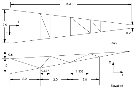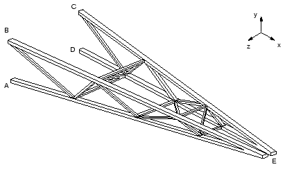A light-service cargo crane is shown in Figure 1. The crane consists of two truss structures joined together by cross bracing. The two main members in each truss structure are steel box beams (box cross-sections). Each truss structure is stiffened by internal bracing, which is welded to the main members. The cross bracing connecting the two truss structures is bolted to the truss structures. These connections can transmit little, if any, moment and, therefore, are treated as pinned joints. ![]() Both the internal bracing and cross bracing use steel box beams with smaller cross-sections than the main members of the truss structures. The two truss structures are connected at their ends (at point E) in such a way that allows independent movement in the 3-direction and all of the rotations, while constraining the displacements in the 1- and 2-directions to be the same. The crane is welded firmly to a massive structure at points A, B, C, and D. The dimensions of the crane are shown in Figure 2. In the following figures, truss A is the structure consisting of members AE, BE, and their internal bracing; and truss B consists of members CE, DE, and their internal bracing. ![]() The ratio of the typical cross-section dimension to global axial length in the main members of the crane is much less than 1/15. The ratio is approximately 1/15 in the shortest member used for internal bracing. Therefore, it is valid to use beam elements to model the crane. |