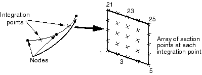 ![]() For this cross-section output is provided at points 1, 5, 21, and 25 by default. The beam element shown in Figure 1 uses a total of 50 section points, 25 at each of the two integration points, to calculate its stiffness. When you request that the beam section properties be precomputed, Abaqus does not calculate the beam's response at the section points. Instead, it uses the section engineering properties to determine the section response. Therefore, Abaqus uses section points only as locations for output, and you need to specify the section points at which you desire output. |