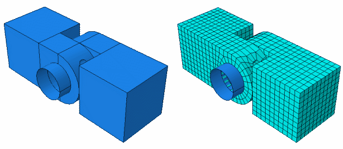 During the tutorial you will create an assembly composed of a hinge held together by a pin. The assembled part instances and the final mesh are illustrated in Figure 1.