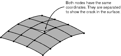 Two nodes with the same coordinates (double nodes) can generate a seam or crack in a valid surface that appears to be continuous, as shown in Figure 5. A node sliding along the surface can fall through this crack and slide behind the contact surface. A large, nonphysical acceleration correction may be caused once penetration is detected. Surfaces defined in Abaqus/CAE will never have two nodes located at the same coordinates; however, imported meshes can have double nodes. Mesh seams can be detected in the Visualization module by drawing the free edges of the model. Any seams that are not part of the desired perimeter can be double-noded regions.