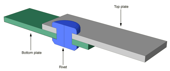 The model consists of two overlapping aluminum plates that are connected with a titanium rivet. The left end of the bottom plate is fixed, and the force is applied to the right end of the top plate to shear the joint. Figure 1 shows the basic arrangement of the components. Because of symmetry, only half of the joint is modeled to reduce computational cost. Frictional contact is assumed. ![]() |