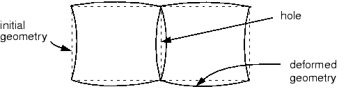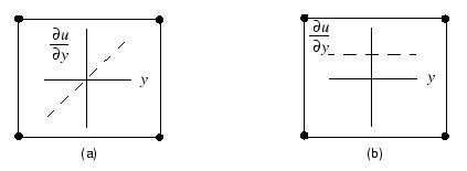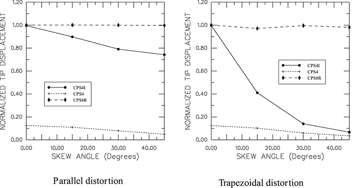 ![]() These enhancements to the deformation gradient are entirely internal to an element and are not associated with nodes positioned along the element edges. Unlike incompatible mode formulations that enhance the displacement field directly, the formulation used in Abaqus does not result in overlapping material or a hole along the boundary between two elements, as shown in Figure 2. ![]() Furthermore, the formulation used in Abaqus is extended easily to nonlinear, finite-strain simulations, something which is not as easy with the enhanced displacement field elements. Incompatible mode elements can produce results in bending problems that are comparable to quadratic elements but at significantly lower computational cost. However, they are sensitive to element distortions. Figure 3 shows the cantilever beam modeled with deliberately distorted incompatible mode elements: in one case with “parallel” distortion and in the other with “trapezoidal” distortion. ![]() Figure 4 shows the tip displacements for the cantilever beam models. The tip displacements are normalized with respect to the analytical solution and plotted against the level of element distortion. ![]() Three types of plane stress elements in Abaqus/Standard are compared: the fully integrated, linear element; the reduced-integration, quadratic element; and the linear, incompatible mode element. The fully integrated, linear elements produce poor results in all cases, as expected. On the other hand, the reduced-integration, quadratic elements give very good results that do not deteriorate until the elements are badly distorted. When the incompatible mode elements are rectangular, even a mesh with just one element through the thickness of the cantilever gives results that are very close to the theoretical value. However, even quite small levels of trapezoidal distortion make the elements much too stiff. Parallel distortion also reduces the accuracy of the element but to a lesser extent. Incompatible mode elements are useful because they can provide high accuracy at a low cost if they are used appropriately. However, care must be taken to ensure that the element distortions are small, which may be difficult when meshing complex geometries; therefore, you should again consider using the reduced-integration, quadratic elements in models with such geometries because they show much less sensitivity to mesh distortion. In a severely distorted mesh, however, simply changing the element type will generally not produce accurate results. The mesh distortion should be minimized as much as possible to improve the accuracy of the results. |