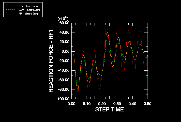 Figure 1 compares the history of the reaction force at one of the top connections (point C) when 1%, 5%, and 10% of critical damping are used. As expected, the oscillations at lower damping levels do not diminish as quickly as those at higher damping levels, and the peak force is higher in the models with lower damping. With damping ratios even as low as 1%, the peak pull-out force is 85 kN, which is still less than the strength of the connection (100 kN). Therefore, the cargo crane should retain its integrity under this drop load.