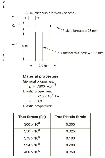 The previous example illustrated some of the convergence difficulties that may be encountered when solving problems involving a nonlinear material response using implicit methods. We will now focus on solving a problem involving plasticity using explicit dynamics. As will become evident shortly, convergence difficulties are not an issue in this case since iteration is not required for explicit methods. The plate is firmly clamped on all four sides and has three equally spaced stiffeners welded to it. The plate is constructed of 25 mm thick steel and is 2 m square. The stiffeners are made from 12.5 mm thick plate and have a depth of 100 mm. Figure 1 shows the plate geometry and material properties in more detail. Since the plate thickness is significantly smaller than any other global dimensions, shell elements can be used to model the plate. ![]() The purpose of this example is to determine the response of the plate and to see how it changes as the sophistication of the material model increases. Initially, we analyze the behavior with the standard elastic-plastic material model. Subsequently, we study the effects of including material damping and rate-dependent material properties. |