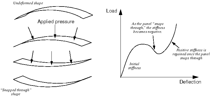 For example, consider a cantilever beam loaded vertically at the tip (see Figure 1). ![]() If the tip deflection is small, the analysis can be considered as being approximately linear. However, if the tip deflections are large, the shape of the structure and, hence, its stiffness changes. In addition, if the load does not remain perpendicular to the beam, the action of the load on the structure changes significantly. As the cantilever beam deflects, the load can be resolved into a component perpendicular to the beam and a component acting along the length of the beam. Both of these effects contribute to the nonlinear response of the cantilever beam (i.e., the changing of the beam's stiffness as the load it carries increases). One would expect large deflections and rotations to have a significant effect on the way that structures carry loads. However, displacements do not necessarily have to be large relative to the dimensions of the structure for geometric nonlinearity to be important. Consider the “snap through” under applied pressure of a large panel with a shallow curve, as shown in Figure 2. ![]() In this example there is a dramatic change in the stiffness of the panel as it deforms. As the panel “snaps through,” the stiffness becomes negative. Thus, although the magnitude of the displacements, relative to the panel's dimensions, is quite small, there is significant geometric nonlinearity in the simulation, which must be taken into consideration. An important difference between the analysis products should be noted here: by default, Abaqus/Standard assumes small deformations, while Abaqus/Explicit assumes large deformations. |