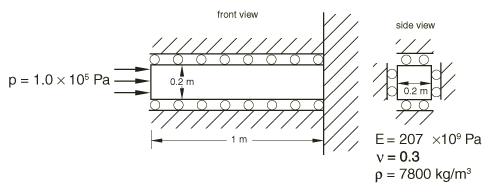 The bar has the dimensions shown in Figure 1. ![]() To make the problem a one-dimensional strain problem, all four lateral faces are on rollers; thus, the three-dimensional model simulates a one-dimensional problem. The material is steel with the properties shown in Figure 1. The free end of the bar is subjected to a blast load with a magnitude of 1.0 × 105 Pa and a duration of 3.88 × 10−5 s. The normalized load versus time is shown in Figure 2. ![]() |