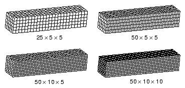 For the theoretical results we choose the coarsest mesh, 25 × 5 × 5, as the base state, and we define the stable time increment, the number of elements, and the CPU time as variables A, B, and C, respectively. As the mesh is refined, two things happen: the smallest element dimension decreases, and the number of elements in the mesh increases. Each of these effects increases the CPU time. In the first level of refinement, the 50 × 5 × 5 mesh, the smallest element dimension is cut in half and the number of elements is doubled, increasing the CPU time by a factor of four over the previous mesh. However, further doubling the mesh to 50 × 10 × 5 does not change the smallest element dimension; it only doubles the number of elements. Therefore, the CPU time increases by only a factor of two over the 50 × 5 × 5 mesh. Further refining the mesh so that the elements are uniform and square in the 50 × 10 × 10 mesh again doubles the number of elements and the CPU time. This simplified calculation predicts quite well the trends of how mesh refinement affects the stable time increment and CPU time. However, there are reasons why we did not compare the predicted and actual stable time increment values. First, recall that we made the approximation that the stable time increment is We then assumed that the characteristic element length, , is the smallest element dimension, whereas Abaqus/Explicit actually determines the characteristic element length based on the overall size and shape of the element. Another complication is that Abaqus/Explicit employs a global stability estimator, which allows a larger stable time increment to be used. These factors make it difficult to predict the stable time increment accurately before running the analysis. However, since the trends follow nicely from the simplified theory, it is straightforward to predict how the stable time increment will change with mesh refinement. |
