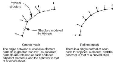 With a coarse mesh as shown in Figure 1, Abaqus may determine several independent surface normals at the same node for adjoining elements. Physically, multiple normals at a single node mean that there is a fold line between the elements sharing the node. While it is possible that you intend to model such a structure, it is more likely that you intend to model a smoothly curved shell; Abaqus will try to smooth the shell by creating an averaged normal at a node. ![]() The basic smoothing algorithm used is as follows: if the normals at a node for each shell element attached to the node are within 20° of each other, the normals will be averaged. The averaged normal will be used at that node for all elements attached to the node. If Abaqus cannot smooth the shell, a warning message is issued in the data (.dat) file. There are two methods that can be used to override the default algorithm. To introduce fold lines into a curved shell, either give the components of as the 4th, 5th, and 6th data values following the nodal coordinates (this method requires manually editing the input file created by Abaqus/CAE in a text editor); or specify the normal direction directly with the NORMAL option (this option can be added using the Abaqus/CAE Keywords Editor; see Cross-section orientation). If both methods are used, the latter takes precedence. See Defining the Initial Geometry of Conventional Shell Elements for further details. |