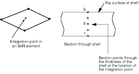If you choose to have the stiffness calculated during the analysis, Abaqus uses numerical integration to calculate the stresses and strains independently at each section point (integration point) through the thickness of the shell, thus allowing nonlinear material behavior. For example, an elastic-plastic shell may yield at the outer section points while remaining elastic at the inner section points. The location of the single integration point in an S4R (4-node, reduced integration) element and the configuration of the section points through the shell thickness are shown in Figure 1. ![]() You can specify any odd number of section points through the shell thickness when the properties are integrated during the analysis. By default, Abaqus uses five section points through the thickness of a homogeneous shell, which is sufficient for most nonlinear design problems. However, you should use more section points in some complicated simulations, especially when you anticipate reversed plastic bending (nine is normally sufficient in this case). For linear problems three section points provide exact integration through the thickness. However, calculating the material stiffness once at the beginning of the analysis is more efficient for linear elastic shells. The material behavior must be linear elastic when the stiffness of the cross-section is calculated only at the beginning of the simulation. In this case all calculations are done in terms of the resultant forces and moments across the entire cross-section. If you request stress or strain output, Abaqus provides default output for the bottom surface, the midplane, and the top surface. |