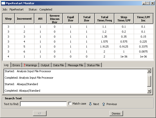![]() This analysis starts at Step 3 since Steps 1 and 2 were completed in the previous analysis. There are now two output database (.odb) files associated with this simulation. Data for Steps 1 and 2 are in the file Pipe.odb; data for Steps 3 and 4 are in the file PipeRestart.odb. When plotting results, you need to remember which results are stored in each file, and you need to ensure that Abaqus/CAE is using the correct output database file. |