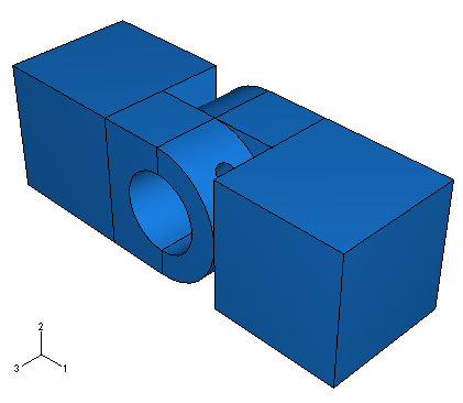 Use the Object field that appears in the context bar to display the solid hinge in the viewport. Abaqus/CAE displays the solid hinge. As before, the cube portion of the solid hinge piece is colored green to indicate that it can be meshed using the structured meshing technique. The flange without the lubrication hole is colored yellow to indicate that it can be meshed using a swept mesh.