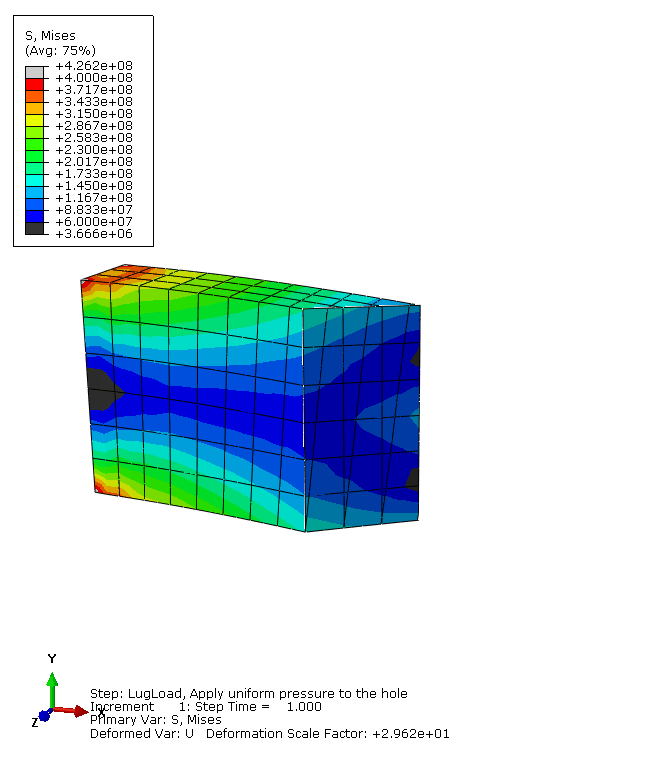 You can cut your model such that interior surfaces are made visible. For example, you may want to examine the stress distribution in the interior of a part. View cuts can be created for such purposes. Here, a simple planar cut is made through the lug to view the Mises stress distribution through the thickness of the part.