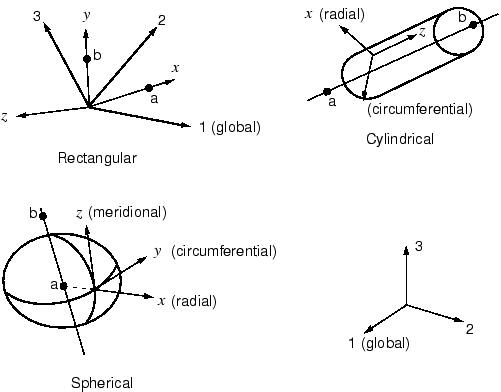 Context: Figure 1 shows local rectangular, cylindrical, and spherical coordinate systems definitions. ![]() You define the orientation of the local (, , ) coordinate system, as well as which of the local axes corresponds to which material direction. Thus, you must specify the local axis (1, 2, or 3) that is closest to being normal to the shell's surface. Abaqus follows a cyclic permutation (1, 2, 3) of the axes and projects the axis following your selection onto the shell region to form the material 1-direction. For example, if you choose the -axis, Abaqus projects the -axis onto the shell to form the material 1-direction. The material 2-direction is defined by the cross product of the shell normal and the material 1-direction. Normally, the final material 2-direction and the projection of the other local axis, in this case the -axis, will not coincide for curved shells. If these local axes do not create the desired material directions, you can specify a rotation about the selected axis. The other two local axes are rotated by this amount before they are projected onto the shell's surface to give the final material directions. For the projections to be interpreted easily, the selected axis should be as close as possible to the shell normal. For example, if the centerline of the cylinder shown in Figure 2 coincides with the global 3-axis, local material directions can be defined such that the local material 1-direction is always circumferential and the corresponding local material 2-direction is always axial. The procedure is described below.