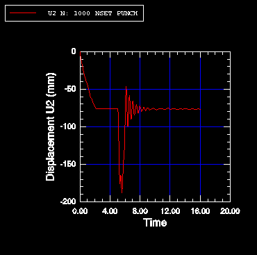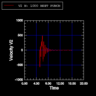 Create a similar X–Y plot of vertical velocity (V2) versus time. You cannot select velocity during the first step because the first step was not a dynamic step; Abaqus/Standard computed velocity and acceleration only during the second and third steps. Use the same X-axis range as before, and use a Y-axis range from 1000 to −1000. Label the Y-axis Velocity V2. The finished plot is shown in Figure 2.