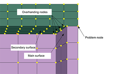 next row of nodes is “hanging over” the rim of the main surface. If this contact pair uses