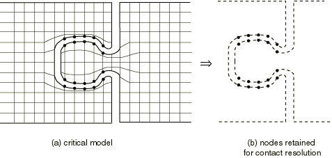 Figure 1 shows a simulation where both of the contacting bodies have been modeled with substructures. The nodes retained in the model are indicated in the figure. If this were a three-dimensional model, general surface elements would be used to reconstruct the appropriate surface geometries of the original mesh.