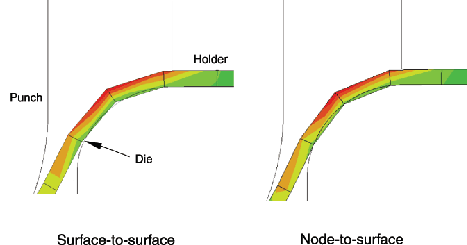 than with node-to-surface discretization, as shown in Figure 8 (the opposite is true at a concave portion of a main surface). Figure 9 shows another case in which the two contact discretizations behave fundamentally