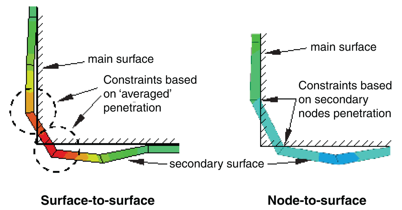 discretization computes penetrations only at secondary nodes, while surface-to-surface