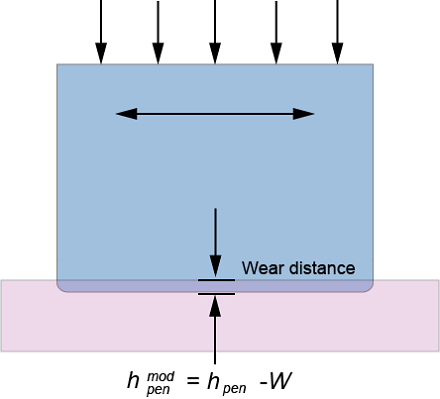 shows two parts in contact. The penetration distance accounting for wear, , corresponds to the penetration distance of the surfaces
