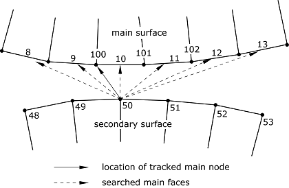 In the example shown in Figure 10, node 50 moves as shown during an increment. In the first iteration of the search Abaqus/Explicit finds that the main surface facet on element 10 is still the closest facet of those