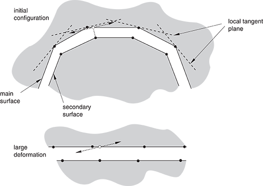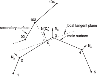 point of contact. In subsequent increments, the -direction for contact at a secondary node evolves such that it