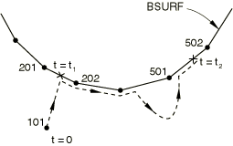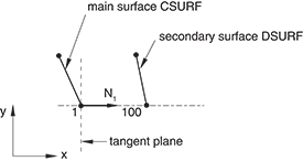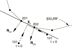 BSURF as the bodies deform. Figure 2 shows the possible evolution of the contact between node 101 and its main surface