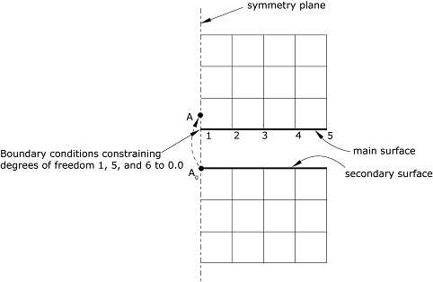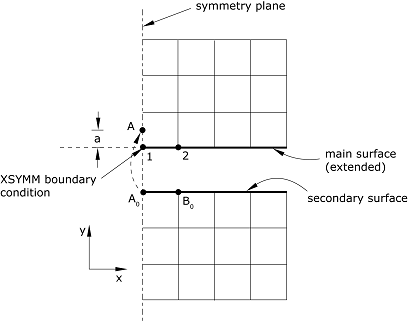 If the main surface does not wrap around the corner (node 1 in Figure 7), the contact logic may give different results depending on how the symmetry boundary