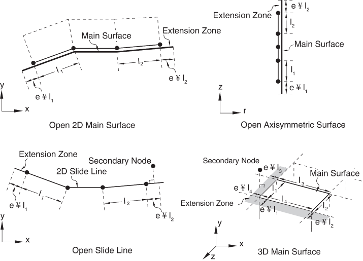 For node-to-surface contact you can specify the size of the extension zone, e, as a fraction of the end segment or facet edge length (see Figure 2). If e is set to zero, Abaqus will not extend the ends. The value given must lie between 0.0 and 0.2. The default value is 0.1 for node-to-surface contact; surface extensions are not available for surface-to-surface contact.