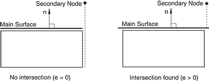 If a secondary node cannot find an intersection with the main surface at the start of the analysis, it will be free to penetrate the main surface because no local tangent plane will be formed. This type of problem, which typically occurs for node-to-surface contact when the secondary node is aligned with the end or perimeter of the main surface (which does not wrap around the corner of the rectangular body), is illustrated in Figure 1 and may be caused by numerical roundoff errors when a preprocessor is used to generate the nodal coordinates. There are no extensions to main faces in the interior of a surface. If the main surface in Figure 1 were defined such that it wrapped around the corner of the body, no extensions to the main surface would be required because the secondary node would project onto the main surface using the projection method discussed in Using the Small-Sliding Tracking Approach. Cases such as that shown in Figure 1 are not problematic for the small-sliding, surface-to-surface formulation because the constraint formulation considers the region of the secondary surface near a secondary node.