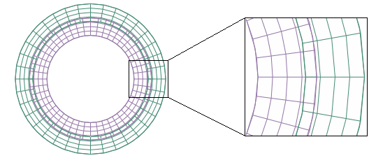 The impact of contact smoothing based on comparison of initial faceted surface geometry to initial idealized surface geometry can be demonstrated by a simple model. Figure 2 shows the initial mesh geometry for a two-dimensional model of concentric cylinders with an interference fit. The concentric cylinders are modeled with first-order elements of different sizes.