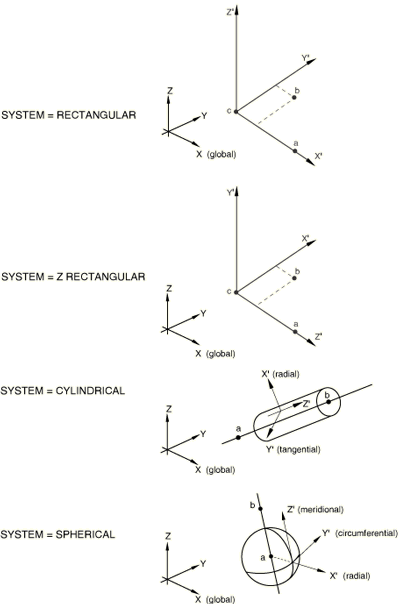 Set SYSTEM=RECTANGULAR (default) to define a rectangular Cartesian system by the three points a, b, and c shown in Figure 1. Point c is the origin of the system, point a must lie on the X -axis, and point b must lie on the X - Y plane. Although not required, it is intuitive to select point b such that it is on or near the local Y -axis.