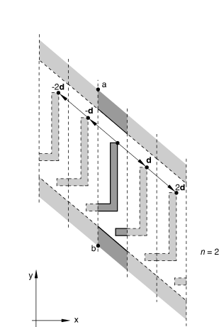 Set TYPE=2D to create a cavity composed of the cavity surface defined in the model and a series of similar images generated by its repetition according to a two-dimensional distance vector. The repeated images are bounded by lines parallel to line (see Figure 1). The distance vector must be defined so that it points away from line and into the domain of the model. This option can be used only for two-dimensional cases.