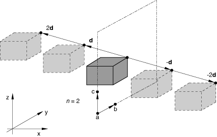 Set TYPE=3D to create a cavity composed of the cavity surface defined in the model and a series of similar images generated by its repetition according to a three-dimensional distance vector. The repeated images are bounded by planes parallel to plane (see Figure 2). The distance vector must be defined so that it points away from plane and into the domain of the model. This option can be used only for three-dimensional cases.