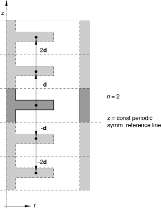 Set TYPE=ZDIR to create a cavity composed of the cavity surface defined in the model and a series of similar images generated by its repetition in the z-direction. The repeated images are bounded by lines of constant z-coordinate (see Figure 3). The z-distance vector must be defined so that it points away from the z-constant periodic symmetry reference line and into the domain of the model. This option can be used only for axisymmetric cases.