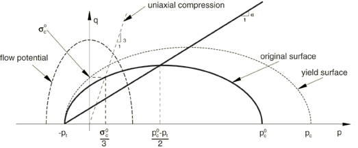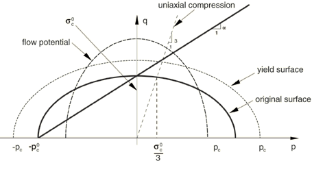 Figure 1. Crushable foam model with volumetric hardening: yield surface and flow