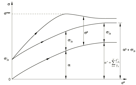 where is the number of backstresses, and , , , , and are material parameters that must be calibrated from cyclic test data. are the initial kinematic hardening moduli, and determine the rate at which the kinematic hardening moduli decrease with