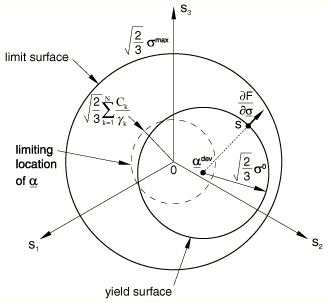 that the backstress is contained within a cylinder of radius , where is the magnitude of at saturation (large plastic strains). It also implies that any stress