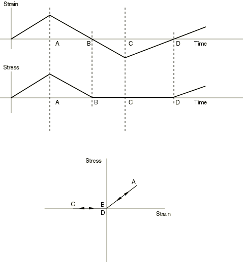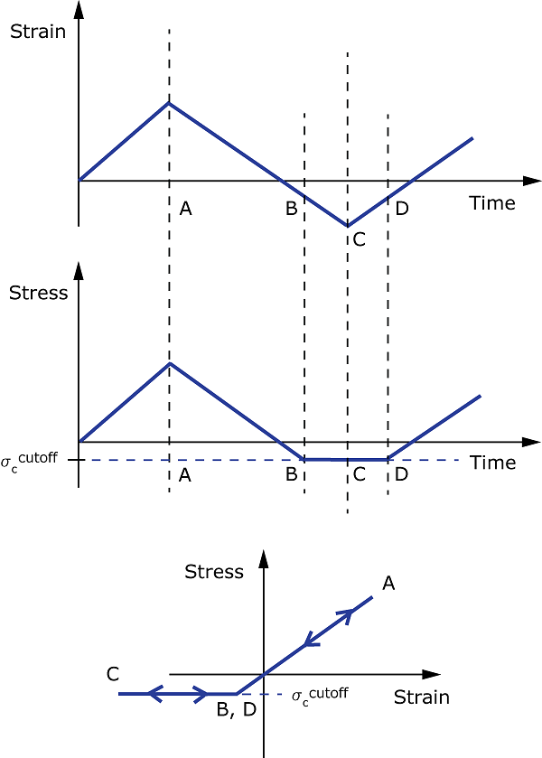 The no compression effect for a one-dimensional stress case such as a truss or a layer of a beam in a plane is illustrated in Figure 1. No compression and no tension definitions modify only the elastic response of the material.