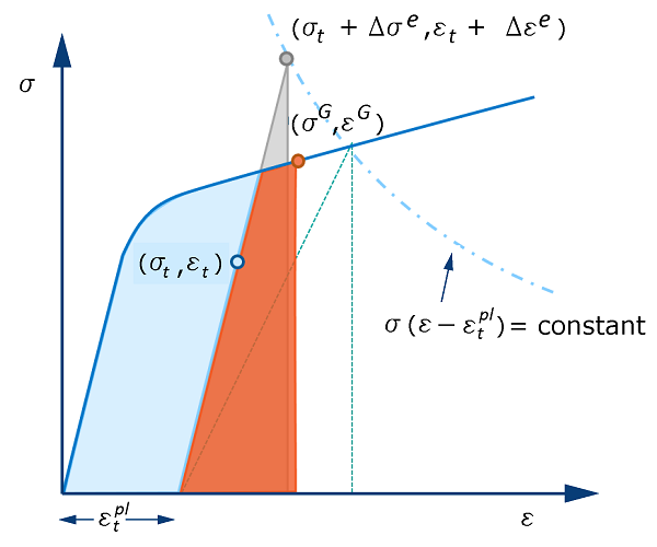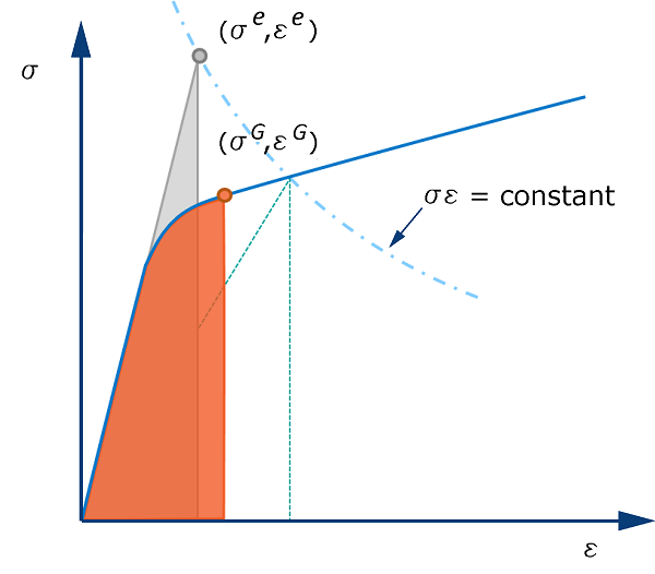 state of the material at the end of the general step. In this case, Abaqus/Standard uses the modified Neuber and Glinka rules, graphically depicted in Figure 3 and Figure 4, to compute the corrected stresses and strains. Abaqus/Standard evaluates the yield stress, taking into account the value of equivalent plastic